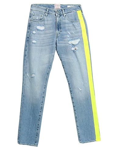 denim, torn fabric, faded, brand logo, side seam stripes, solid color with appliqués, medium wash, high waisted, tapered leg, regular fit, five pockets, tapered model