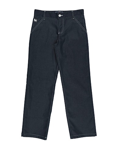 woven, denim effect, brand logo, solid color, 1 button, zipper fastening, multipockets, stretch, hand wash or dry clean, do not bleach