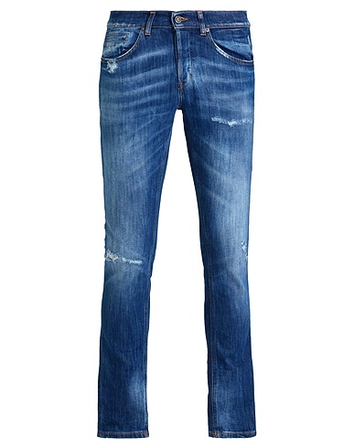 straight-leg jeans, model: george, denim, faded, distressed, solid color, brand logo, medium wash, mid rise, slim fit, concealed button fastenings, five pockets, machine wash, do not tumble dry