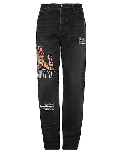 straight-leg jeans, denim, faded, solid color with appliqués, leather trims, embroidered, colored wash, high waisted, regular fit, button fastenings, five pockets, do not wash, do not bleach, do not tumble dry, contains non-textile parts of animal origin