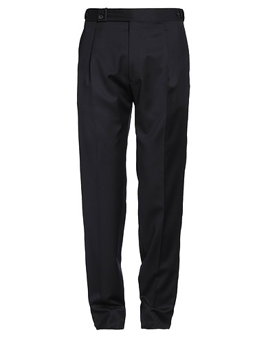 tailored pants, wool, satin, solid color, side seam stripes, mid rise, tapered leg, regular fit, zipper fastening, button fastenings, multipockets, dry clean, do not bleach, do not tumble dry