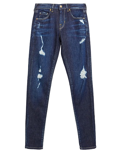 skinny jeans, denim, distressed, solid color, brand logo, dark wash, low waisted, slim fit, zipper fastening, button fastenings, multipockets, stretch, machine wash, do not bleach, do not tumble dry