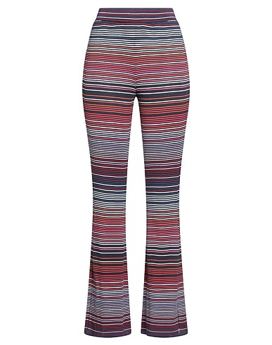 flared pants, intarsia-knit, lightweight knit, striped, no appliqués, high waisted, elasticized waist, relaxed fit, hand wash or dry clean, do not bleach, do not tumble dry
