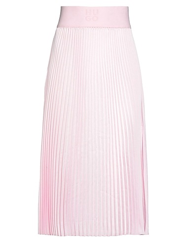 pleated skirt, satin, solid color, brand logo, pleated, elasticized waist, side slit, hand wash or dry clean, do not bleach, do not tumble dry, be the best-dressed bridesmaid or wedding guest with this designer piece, perfect for any ceremony