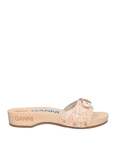 slide sandals, canvas, floral-print, brand logo, round toe, block heel, rubber sole, fabric inner