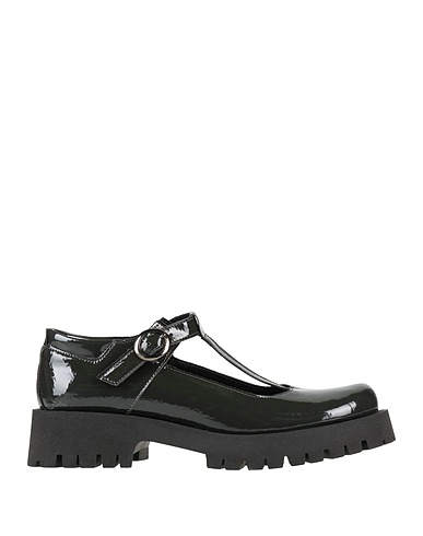 t-bar, patent leather, solid color, no appliqués, lined interior, buckle fastening, round toe, low heel, lug sole, contains non-textile parts of animal origin