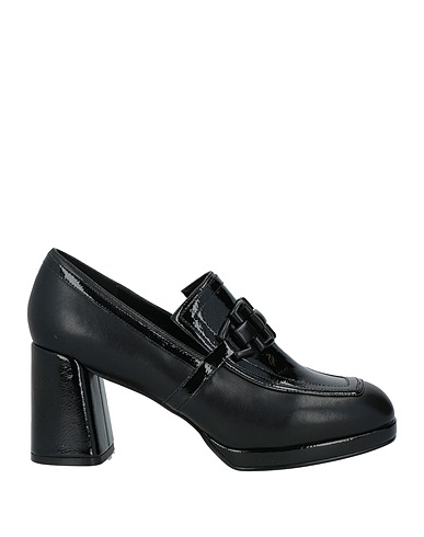 loafers, leather, patent leather, solid color with appliqués, embellished, leather lining, round toe, square heel, leather/rubber sole, contains non-textile parts of animal origin