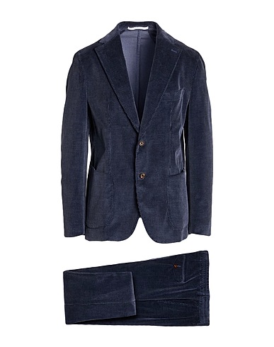 single-breasted suit, corduroy, solid color, no appliqués, lapel collar, long sleeves, partially lined, button fastenings, zipper fastening, patch pockets, welt pocket, dual back vents, high waisted, drawstring waist, contains non-textile parts of animal origin, dry clean, do not bleach, do not tumble dry