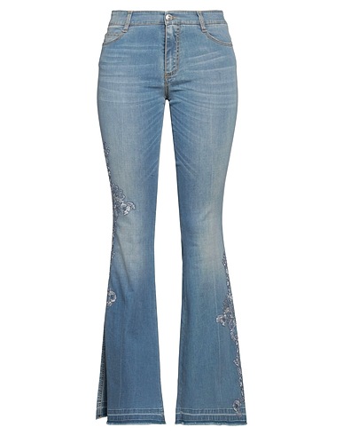 denim, faded, brand logo, embroidered, solid color with appliqués, medium wash, mid rise, flared cut, slim fit, zipper fastening, 1 button, fringed hem, multipockets, stretch, machine wash or dry clean, do not tumble dry, do not bleach, flare & wide-leg