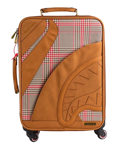 carry-on, coated fabric, suede-effect fabric, glen plaid, brand logo, internal pockets, fully lined, dual buckle closure, external pocket with zip, four wheels, soft shell