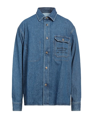 деним, эффект "делаве", логотип бренда, однотонная расцветка с принтом, классический цвет, классический воротник, длинные рукава, застёжка в виде пуговиц, один кармашек, машинная стирка, нельзя отбеливать, нельзя выжимать и сушить в стиральной машине