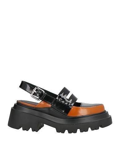 slingback pumps, glossed-leather, two-tone, no appliqués, leather lining, buckle fastening, round toe, square heel, rubber cleated sole, contains non-textile parts of animal origin