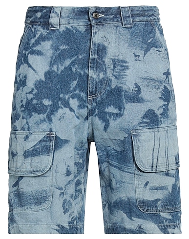 cargo shorts, denim, faded, hawaiian-print, brand logo, medium wash, high waisted, belt loops, zip fastening, 1 button, five pockets, this brand runs large