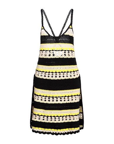 knitted, heavy-weight knit, no appliqués, multicolour pattern, deep neckline, sleeveless, no pockets, side slit hemline