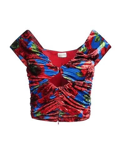crop top, chenille, floral-print, draped, deep neckline, short sleeves, fully lined, zip fastening, stretchy fabric, dry clean, do not bleach, do not tumble dry