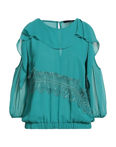 top, crepe, plain colour, no appliqués, crewneck, 3/4 length sleeves, 1 button, dry clean, do not bleach, do not tumble dry