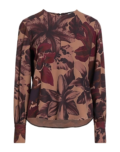 top, crepe, floral-print, no appliqués, crewneck, long sleeves, buttoned cuffs, 1 button, machine wash, do not bleach, do not tumble dry