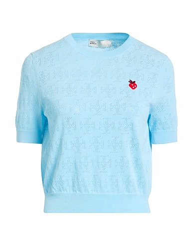 knitted, lightweight knit, perforated, embroidered, logo-print, crewneck, short sleeves, dry clean, do not bleach, do not tumble dry