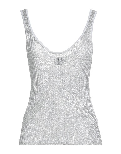 top, knitted, metallic, lightweight knit, plain colour, no appliqués, deep neckline, sleeveless, hand wash, do not bleach, do not tumble dry