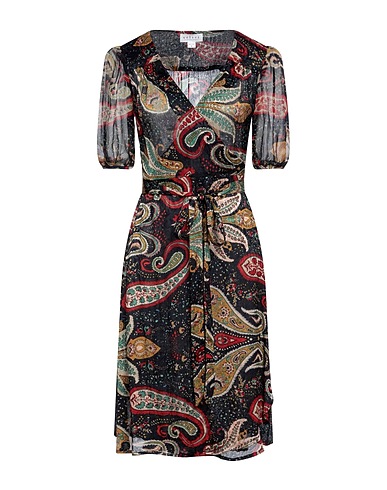 crepe, no appliqués, paisley-print, multicolour pattern, deep neckline, short sleeves, unlined, self-tie closure, no pockets, trapeze style