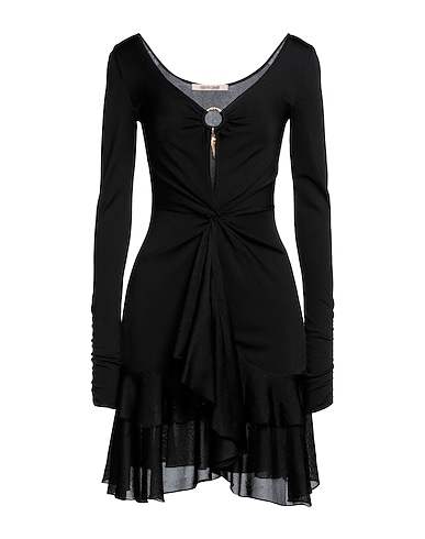 flared dress, knitted, lightweight knit, plain colour, metal applications, tiered, v-neck, long sleeves, partially lined, without pockets