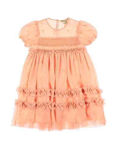 tulle, embroidered, shirred, ruffles, plain colour with appliqués, crewneck, short sleeves, fully lined, button fastenings, without pockets, hand wash, do not bleach, do not tumble dry, do not iron