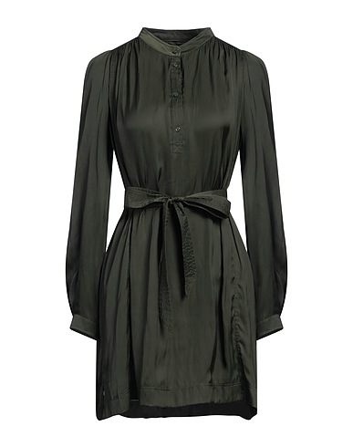 shirt dress, satin, plain colour, belt, mandarin collar, long sleeves, buttoned cuffs, unlined, button fastenings, side slit hemline, hand wash or dry clean, do not bleach, do not tumble dry