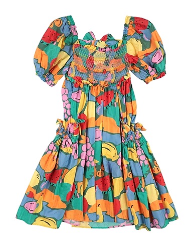 woven, multicolour, shirred, half-belt, deep neckline, short sleeves, puffed sleeves, unlined, slit pockets, machine wash, do not bleach, do not tumble dry