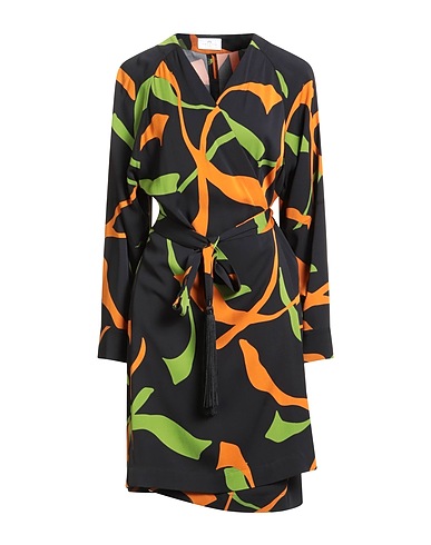 wrap dress, crepe, stretchy fabric, multicolour, belt, v-neck, long sleeves, buttoned cuffs, unlined, tie fastening, multipockets, machine wash or dry clean, do not bleach, do not tumble dry