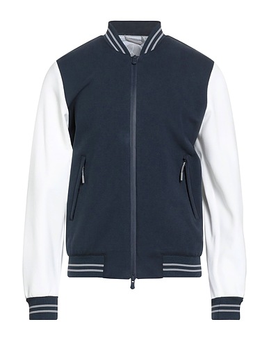 varsity jacket, jersey, stretchy fabric, brand logo, two-tone, crewneck, long sleeves, unlined, zip fastening, zipped pockets, machine wash, do not bleach, do not tumble dry