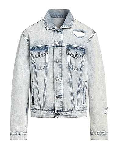 denim, distressed, embroidered logo, plain colour, light wash, classic collar, single-breasted , long sleeves, unlined, button fastenings, multipockets, hand wash, do not bleach, do not tumble dry, denim trucker jacket