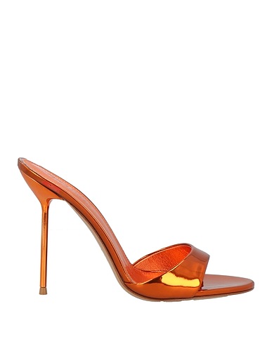 leather, laminated effect, no appliqués, plain colour, leather backing, round toeline, spike heel, leather sole, contains non-textile parts of animal origin, slide sandals