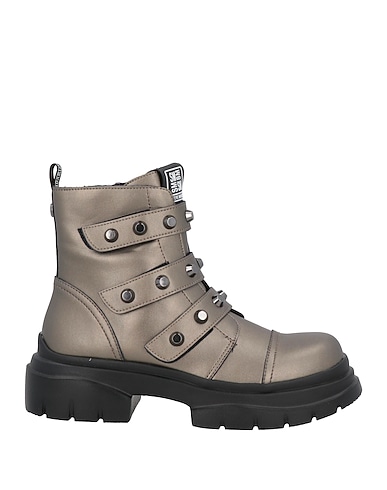 chunky boots, leather, metallic, studs, brand logo, plain colour with appliqués, fully lined, zip fastening, round toe, square heel, lug sole, contains non-textile parts of animal origin
