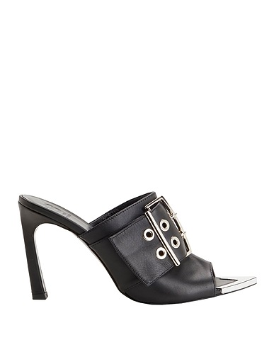 leather, buckle, studs, plain colour with appliqués, leather lining, pointed toe, stiletto heel, covered heel, rubber sole, contains non-textile parts of animal origin, slide sandals