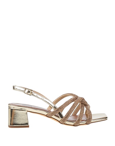 sandals, coated fabric, metallic, plain colour with appliqués, crystals, leather lining, buckle fastening, square toe, square heel, covered heel, rubber sole, contains non-textile parts of animal origin