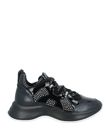 patent leather, brand logo, crystals, plain colour with appliqués, leather lining, lace-up, round toe, flat, rubber cleated sole, contains non-textile parts of animal origin, chunky trainers