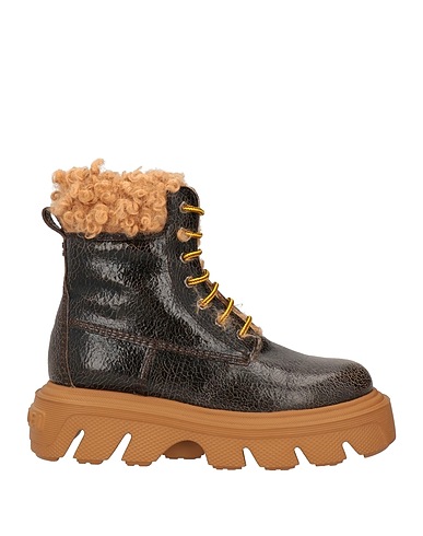 textured-leather, brand logo, two-tone, lined in shearling, lace-up, round toe, square heel, rubber cleated sole, contains non-textile parts of animal origin, chunky boots