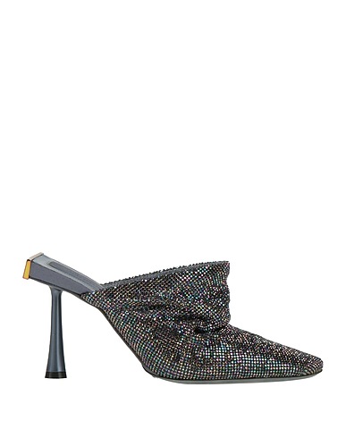mules, metal, plain colour with appliqués, brand logo, crystals, leather lining, pointed toe, geometric heel, leather/rubber sole, contains non-textile parts of animal origin