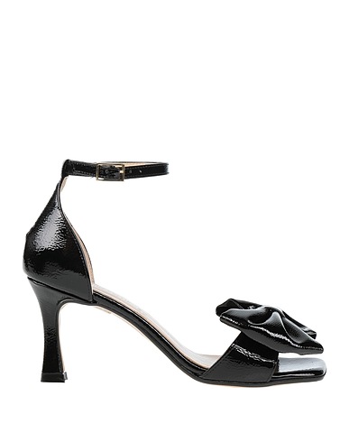 ankle strap sandals, coated fabric, patent-effect, plain colour with appliqués, bow-detailed, leather lining, buckle-fastening ankle strap, square toe, spike heel, leather sole, contains non-textile parts of animal origin