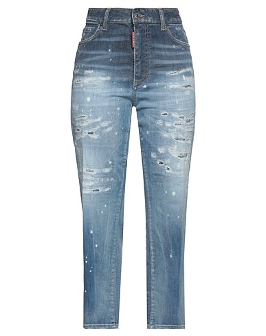 boyfriend jeans, denim, faded, torn fabric, stretchy fabric, plain colour, leather trims, brand logo, light wash, mid rise, tapered leg, 1 button, zip fastening, five pockets, contains non-textile parts of animal origin