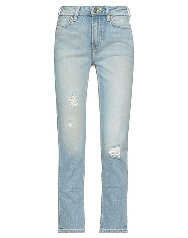 skinny jeans, denim, distressed, stained effect, plain colour, brand logo, leather trims, light wash, mid rise, zip fastening, 1 button, five pockets, contains non-textile parts of animal origin