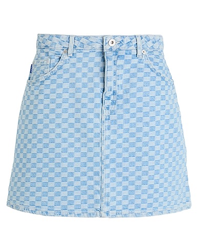 flared skirt, denim, brand logo, checked, light wash, belt loops, 1 button, zip fastening, multipockets, machine wash, do not bleach, do not tumble dry