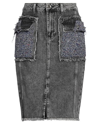 pencil skirt, denim, tweed, brand logo, embellished, plain colour with appliqués, coloured wash, unlined, zip fastening, 1 button, front slit, flap pockets, machine wash, do not bleach, do not tumble dry