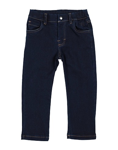 denim, plain colour, embroidered logo, dark wash, mid rise, snap fastenings, five pockets, machine wash or dry clean, do not tumble dry