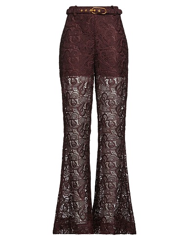 flared trousers, lace, plain colour with appliqués, belt, high waisted, regular fit, zip fastening, dry clean, do not bleach, do not tumble dry
