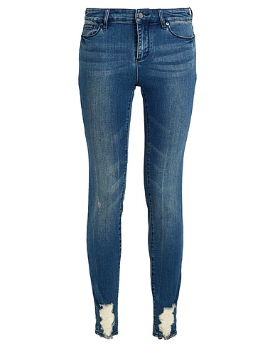 skinny jeans, denim, distressed, stretchy fabric, plain colour, brand logo, medium wash, mid rise, belt loops, slim fit, zip fastening, 1 button, machine wash, do not bleach, do not tumble dry