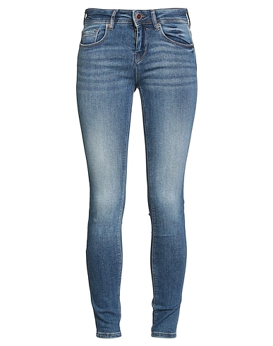 skinny jeans, denim, faded, stretchy fabric, plain colour, brand logo, medium wash, mid rise, slim fit, 1 button, zip fastening, multipockets, machine wash, do not bleach, tumble dry