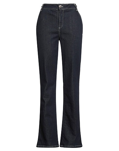flared jeans, denim, plain colour, brand logo, embellished, dark wash, high waisted, belt loops, regular fit, 1 button, zip fastening, slit pockets, patch pockets, machine wash or dry clean, do not bleach, do not tumble dry