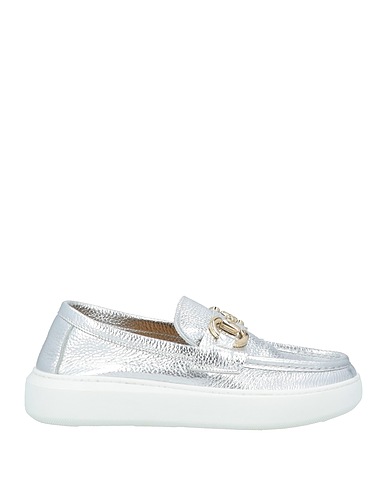 loafers, pebbled-leather, metallic, plain colour with appliqués, embellished, leather lining, round toe, flat, rubber cleated sole, contains non-textile parts of animal origin