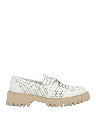 loafers, leather, perforated, plain colour with appliqués, brand logo, leather lining, round toe, flat, lug sole, contains non-textile parts of animal origin